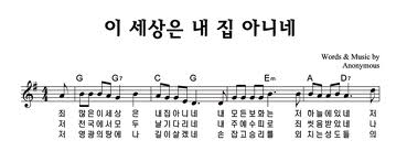 '죄 많은 이 세상은 내 집 아니네. 내 모든 보화는 저 하늘에 있네. 저 천국 문을 열고 나를 부르네. 나는 이 세상에 정들 수 없도다.